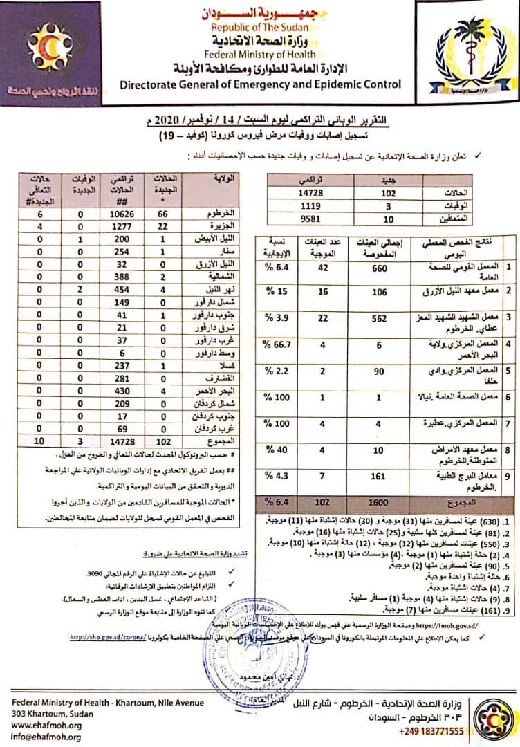 تقرير وزارة الصحة: زيادة في حالات ووفيات كورونا بالسودان