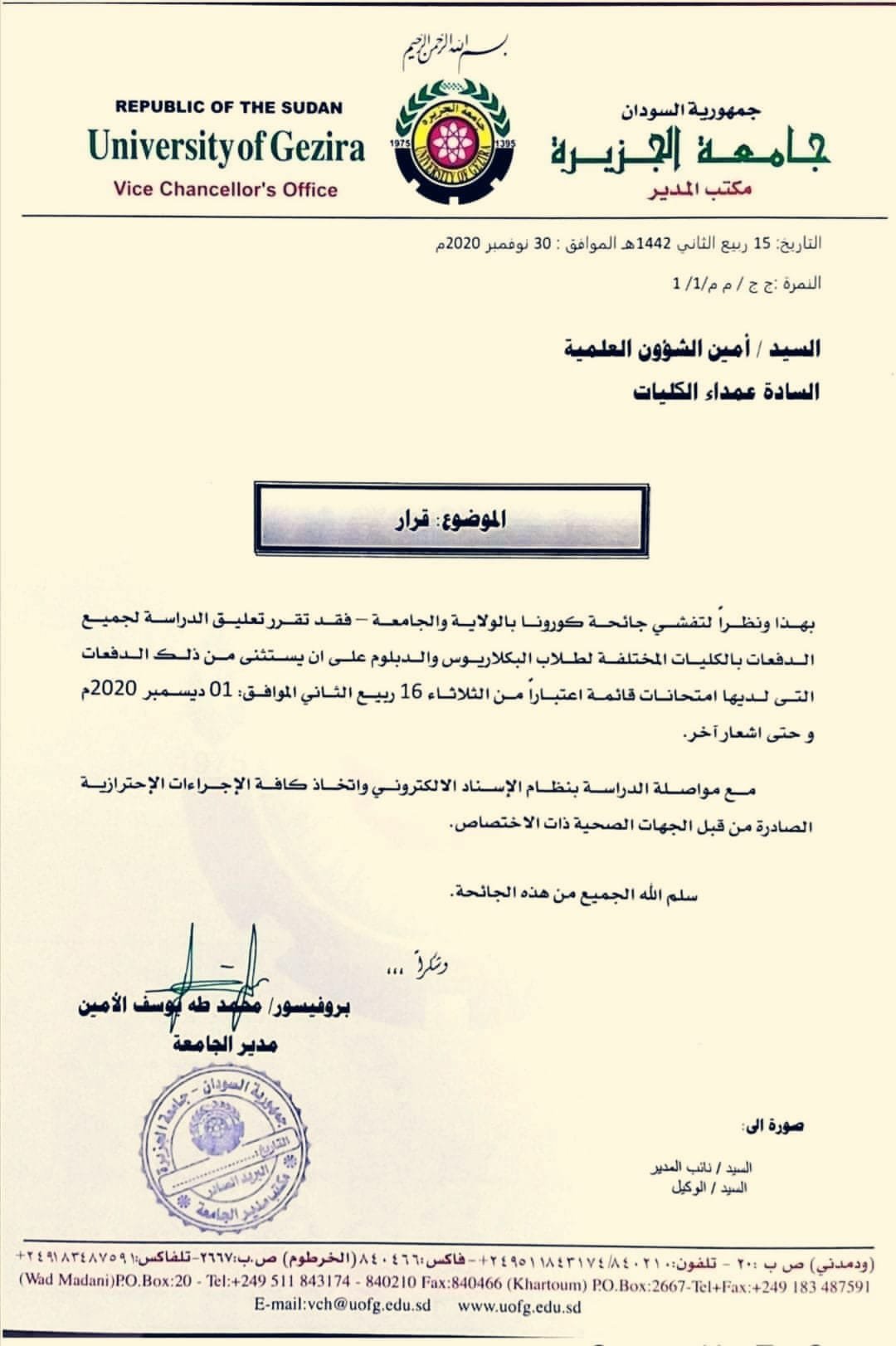 تعليق الدراسة بجامعة الجزيرة بسبب كورونا