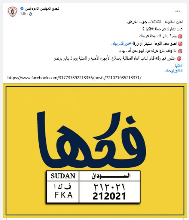 ونشر تجمع المهنيين على صفحته الرسمية بفيسبوك منشورا لــ”للجان المقاومة بالكلاكلات جنوب” يدعو المواطنين للمشاركة في حملة “فكها” لفك لوحات سياراتهم وتركيب ورقة بدلا عنها تحمل عبارة ” من قتل بهاء”.