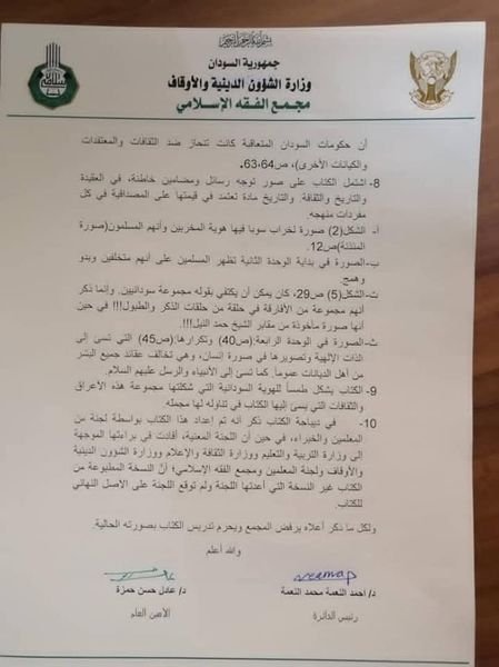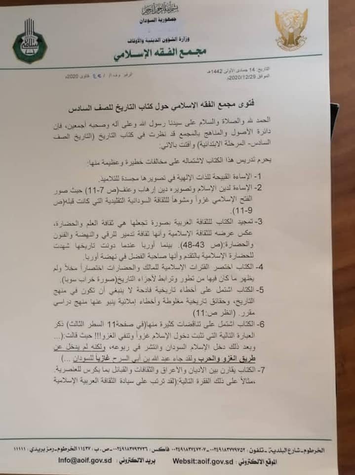 أصدر مجمع الفقه الإسلامي السوداني فتوى شرعية حرّم فيها تدريس كتاب التاريخ للصف السادس بالمرحلة الابتدائية في جمهورية السودان. وقال المجمع أن الكتاب يشمل مخالفات وصفها بالخطيرة والعظيمة.