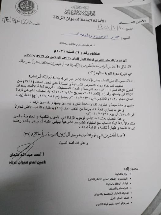 ديوان الزكاة يحدد النصاب في السودان لعام 2021 في يناير 12, 2021 شارك الخبر لمجموعاتك: حدد ديوان الزكاة نصاب الزكاة للعام ٢٠٢١م في السودان بمبلغ مليون ومائة وسبعة وعشرون ألف وستمائة اثنان وخمسون ألف وخمسة جنيهات.