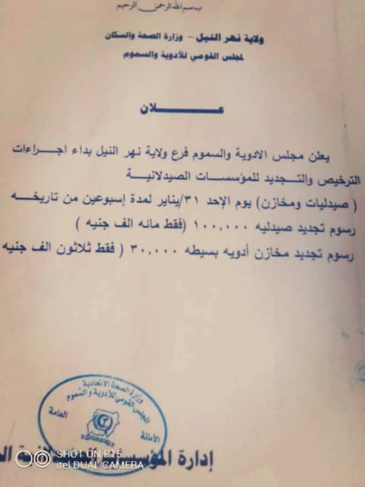 ولاية نهر النيل: رسوم تجديد ترخيص الصيدلية 100 ألف جنيه
