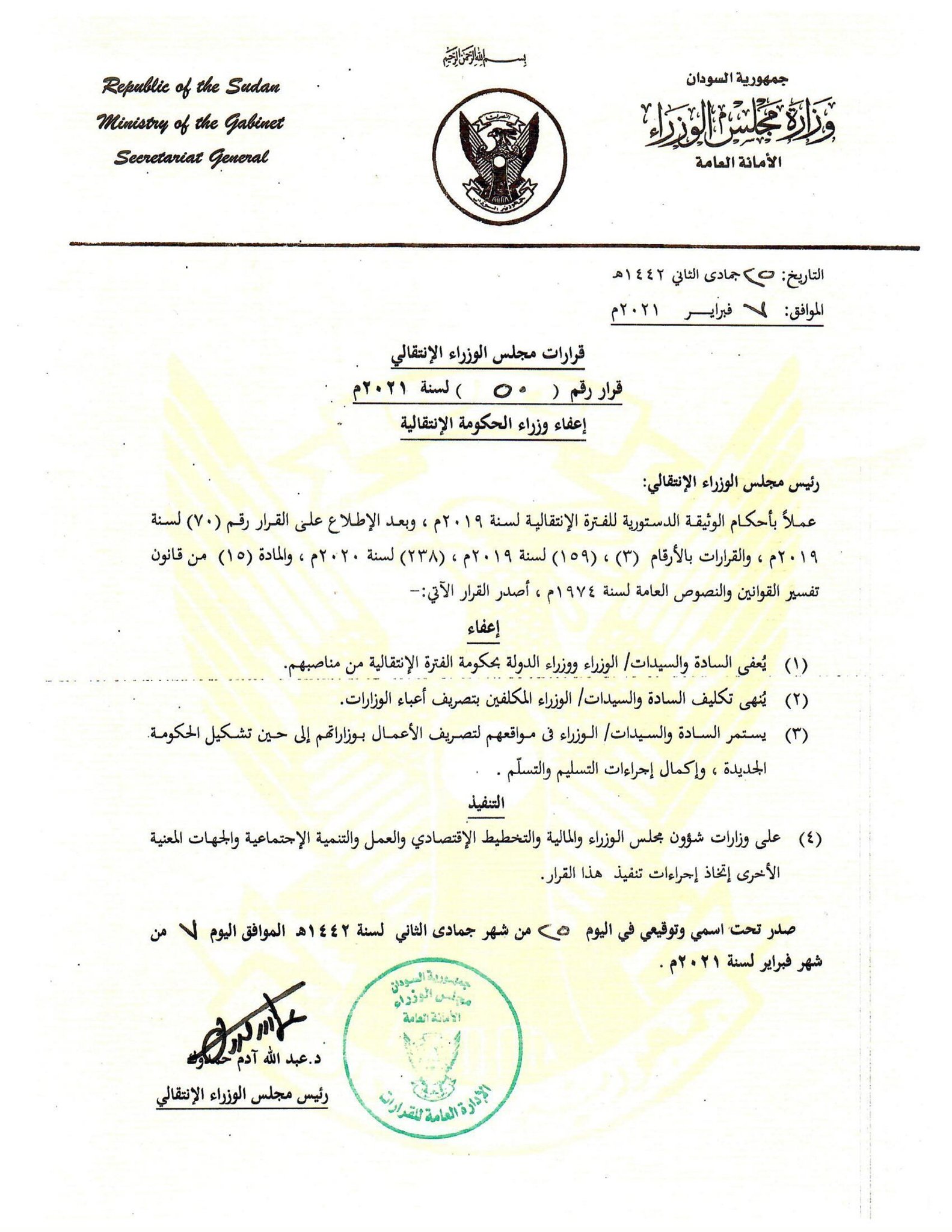 انعقد اليوم الأحد 7 فبراير 2021م اجتماعٌ استثنائيٌّ لمجلس الوزراء الانتقالي، ترأسه رئيس مجلس الوزراء د. عبد الله حمدوك، في إطار مشاوراته مع السيدات والسادة الوزراء أعضاء الحكومة الانتقالية بشأن المساعي الحثيثة لاستكمال هياكل السلطة الانتقالية. ولإفساح المجال لتشكيل الحكومة الجديدة، خلص الاجتماع إلى إبلاغ السيدات والسادة الوزراء بإنهاء تكليفهم من الوزارة حتى يتسنى تكوين الوزارة الجديدة. وبناء عليه، أصدر السيد رئيس الوزراء قراراً اليوم بإعفاء السيدات والسادة الوزراء والوزراء المكلفين من مواقعهم.