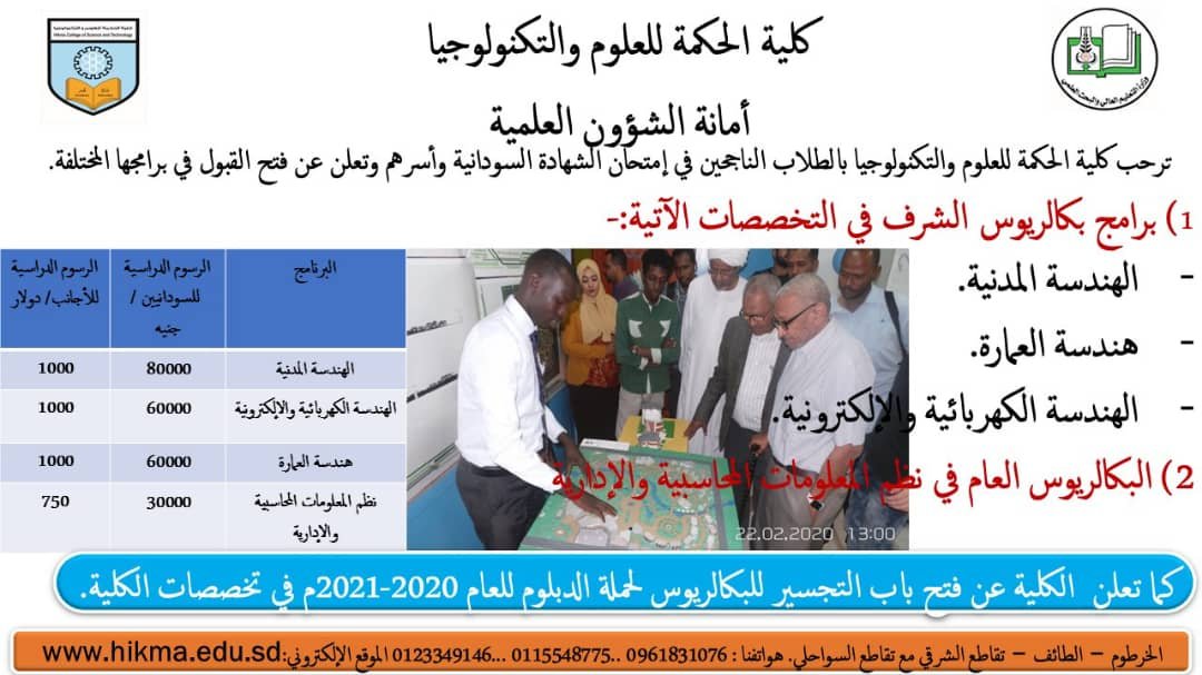 كلية الحكمة للعلوم والتكنلوجيا تعلن عن القبول في برامجها المحتلفة في فبراير 18, 2021 شارك الخبر لمجموعاتك:
