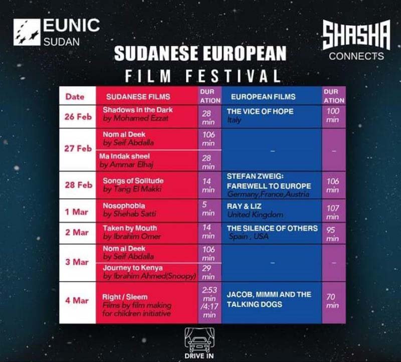 ينطلق بالخرطوم يوم الجمعة 26 فبراير مشروع مهرجان سينما السيارات بالخرطوم “شاشة – صلات إبداعية” عبر شراكة إستراتيجية بين الاتحاد الأوروبي بالسودان والمجلس الثقافي البريطاني ، ويعرض المهرجان مجموعة من الأفلام الأوروبية. وتشارك برعاية المهرجان مجموعة دال الغذائية وشركة زين وراديو كابيتال ويستمر حتى الرابع من مارس ، بمسرح معرض الخرطوم الدولي في بُري.