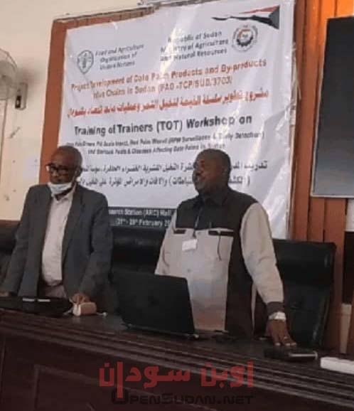 نظمت وزارة الزراعة والموارد الطبيعية بالتعاون منظمة الفاو بقاعة بحوث شمبات دورة تدريبية لتدريب المدربين في مجالات “حشرة النخيل القشرية الخضراء، وسوسة النخيل الحمراء – الكشف المبكر والإحتياطات- والآفات والأمراض المؤثرة على النخيل بالسودان” تحت إشراف الدكتور مهدي عبدالرحمن أحمد الخبير الوطني للفاو وضمن مشروع تطوير سلسلة القيمة المضافة لنخيل التمر وعمليات مابعد الحصاد بالسودان.