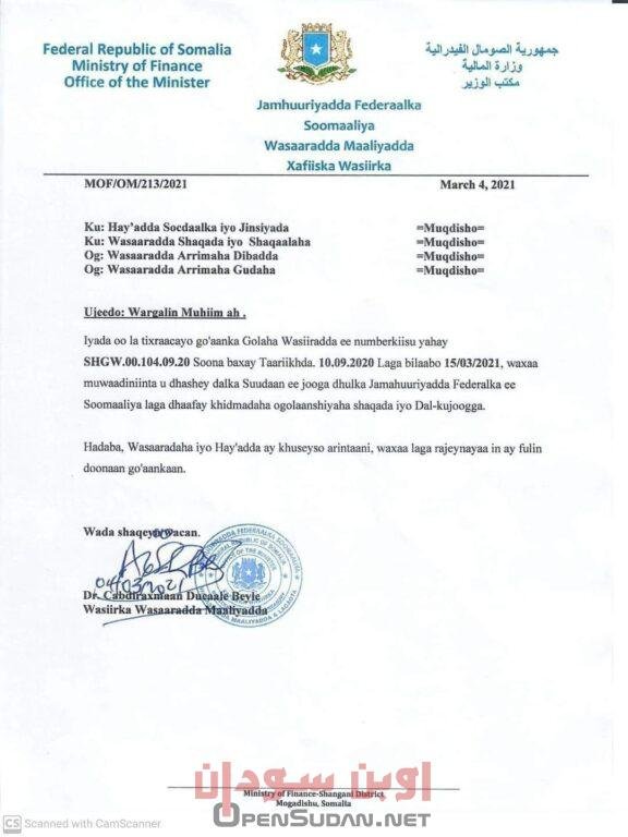 أعلنت الحكومة الصومالية عن إعفاء مواطني دولة السودان المقيمين في الصومال من ضرائب العمل ورسوم الإقامة. وصدر القرار عن مكتب وزير المالية الصومالي عبد الرحمن دوعالي بيلي. ويعمل في الصومال سودانيون مع المنظمات الدولية العاملة هناك. بالإضافة للقطاع الطبي وقطاعات أخرى.