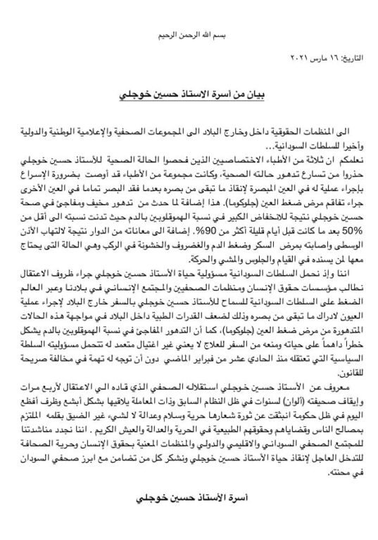 ناشدت أسرة الإعلامي المعتقل حسين خوجلي المجتمع الصحفي السوداني والإقليمي والدولي والمنظمات المعنية بحقوق الإنسان وحرية الصحافة للتدخل العاجل لإنقاذ حياة الأستاذ حسين خوجلي. وقالت الأسرة في بيان صحفي أن حالته الصحية تستدعي علاجاً عاجلاً لا يتوفر داخل السودان، وهو ما لم تسمح به السلطات حتى الآن، مما اعتبرته الأسرة محاولة للاغتيال المتعمد له، وحمّلت السلطات المسئولية جراء ذلك.