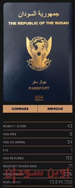 ويتيح جواز السفر السوداني لحامله دخول 8 دول بلا تأشيرة، و34 دولة بتأشيرة عند الوصول، و155 دولة تتطلب تأشيرة مسبقة.