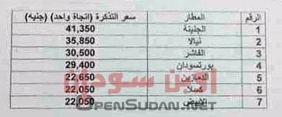 والأسعار الجديدة لتذاطر الطيران الداخلي للتذكرة (اتجاه واحد) من الخرطوم كالآتي: