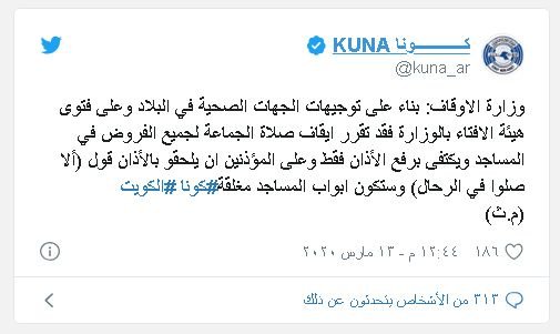 اعلت دولة الكويت عن اغلاق المساجد وايقاف صلاة الجماعة تجنبا لفايروس كورونا بعد فتوى من وزارة الافتاء .