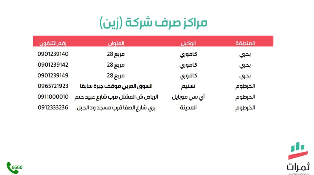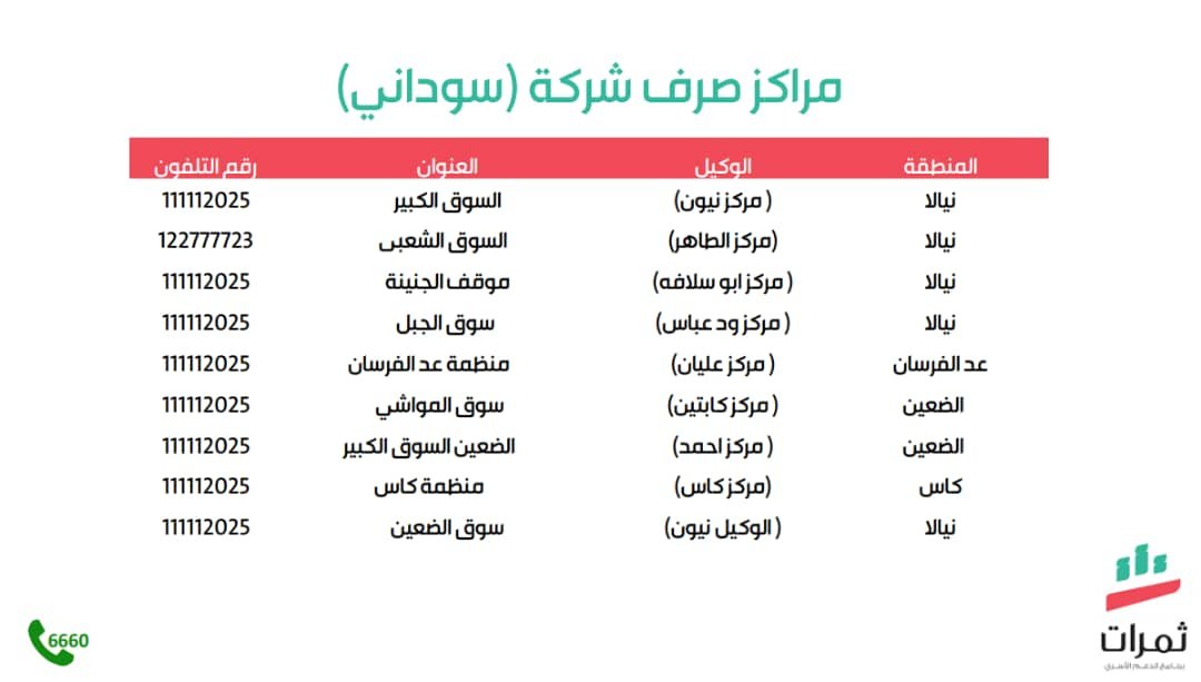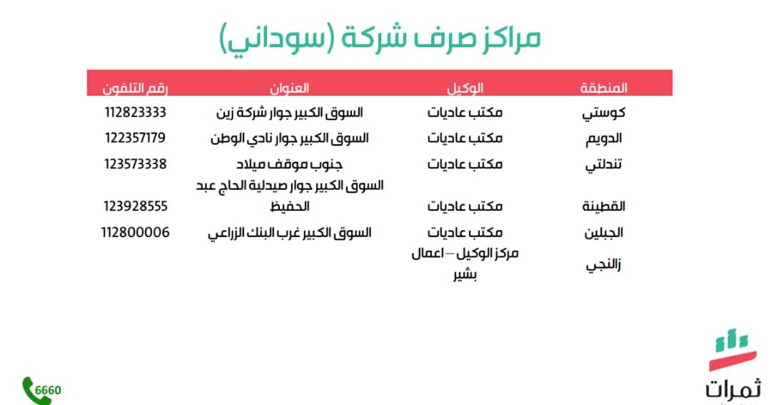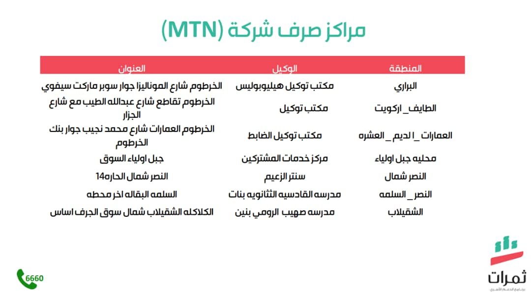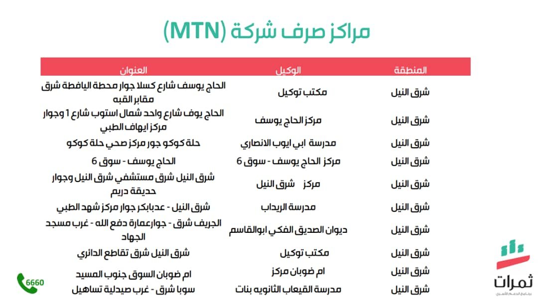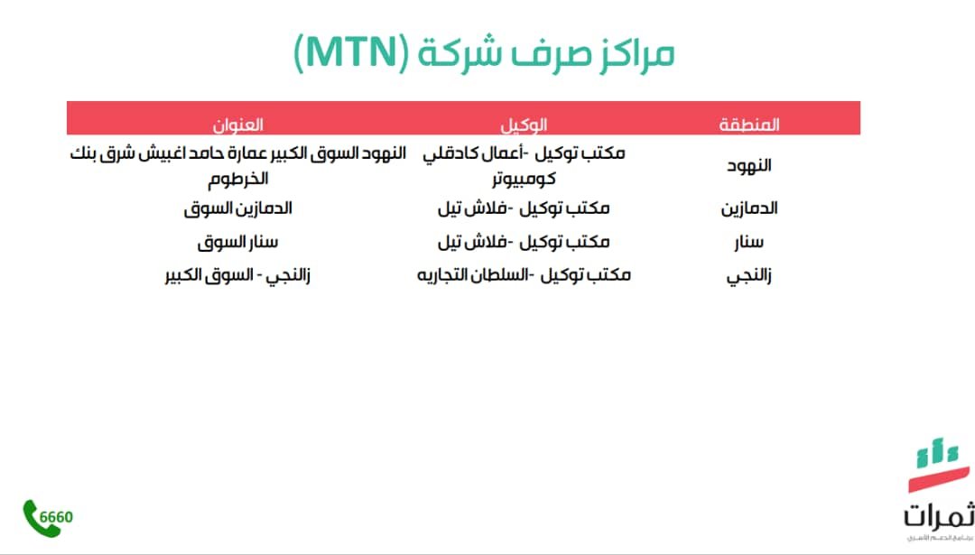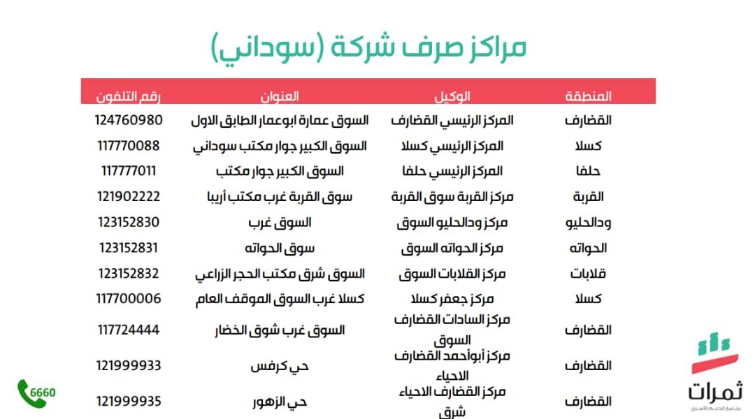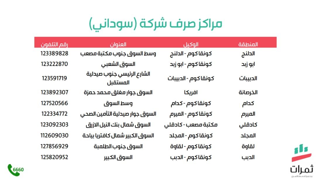نشر برنامج دعم الأسر السودانية “ثمرات” إرشادات جديدة لاستلام القيمة المالية الشهرية التي يقدمها عبر مراكز تابعة لشركات الاتصالات في ولايات السودان المختلفة. وحذر البرنامج من التعامل مع الوسطاء الذي يأخذون مبالغ مالية من المواطنين لمساعدتهم على استلام مستحقاته من برنامج ثمرات. أدناه قائمة بالمراكز المعتمدة التي نشرها “ثمرات”: