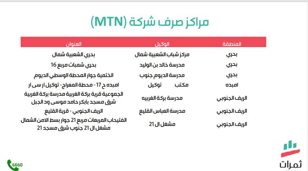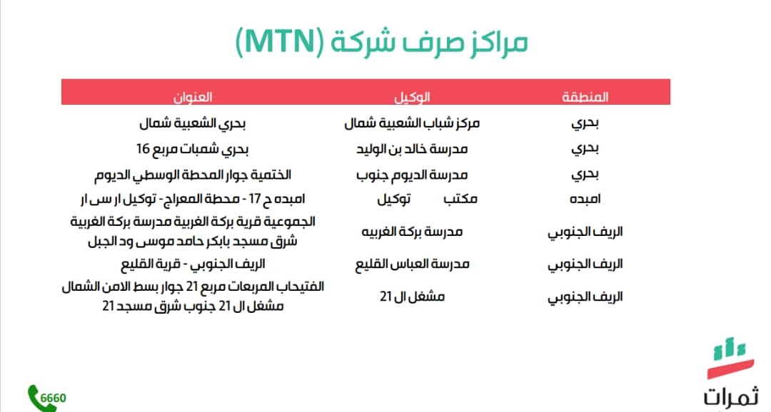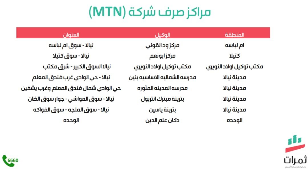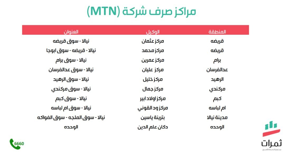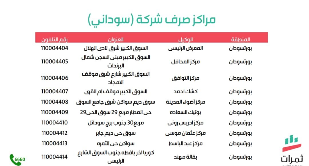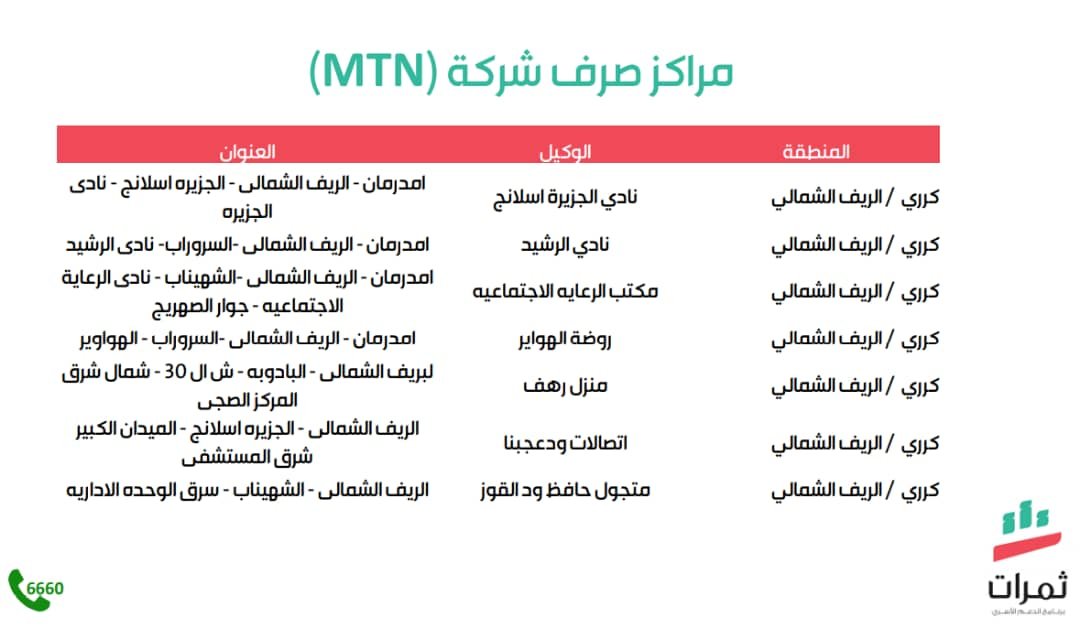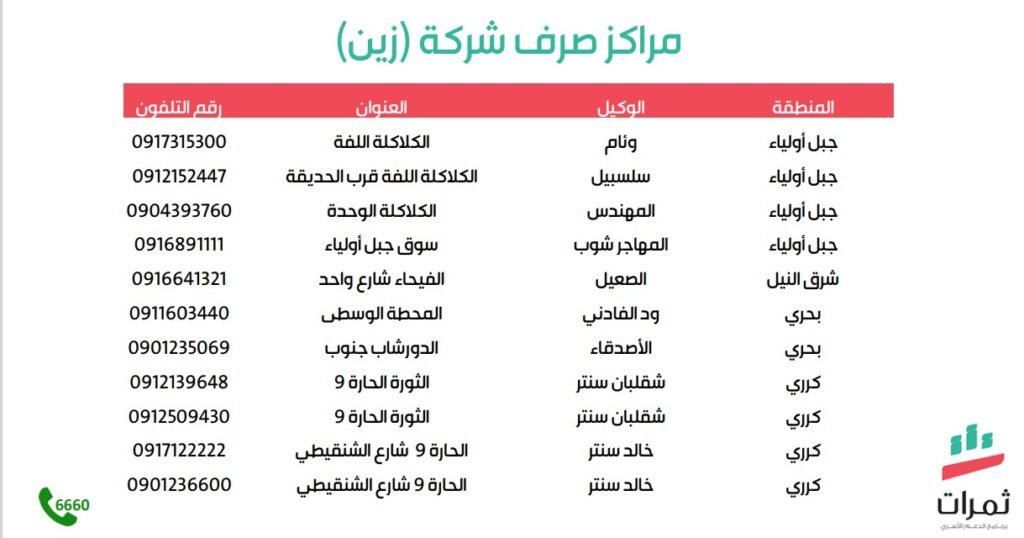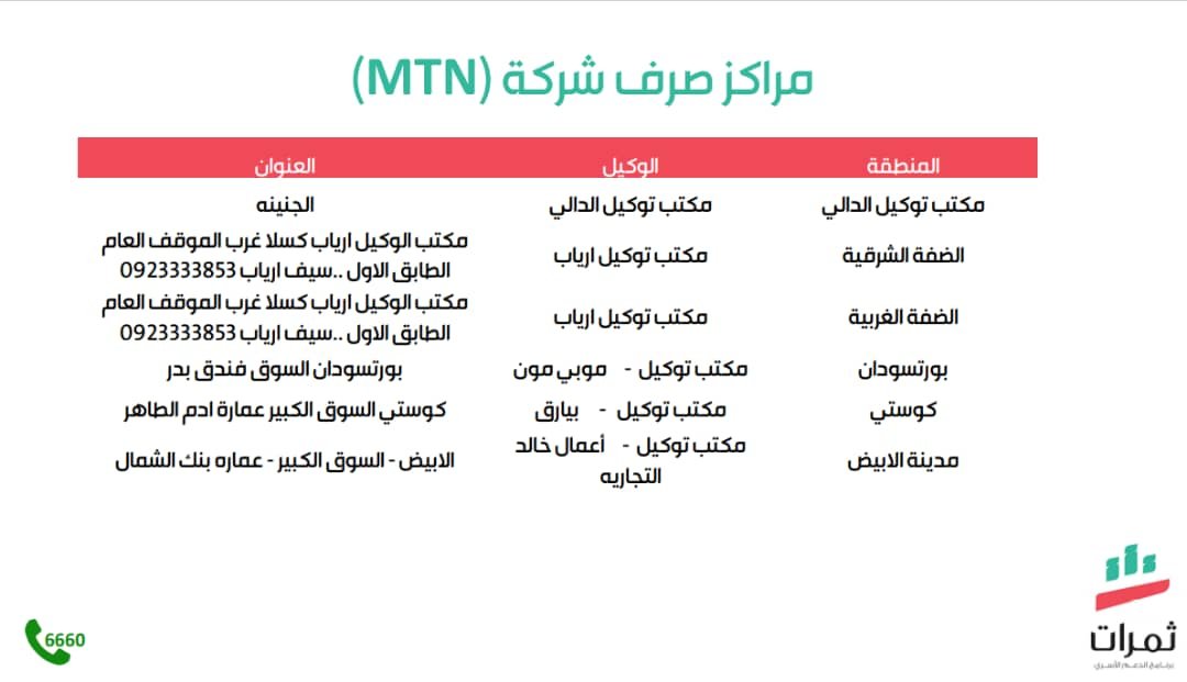 نشر برنامج دعم الأسر السودانية “ثمرات” إرشادات جديدة لاستلام القيمة المالية الشهرية التي يقدمها عبر مراكز تابعة لشركات الاتصالات في ولايات السودان المختلفة. وحذر البرنامج من التعامل مع الوسطاء الذي يأخذون مبالغ مالية من المواطنين لمساعدتهم على استلام مستحقاته من برنامج ثمرات. أدناه قائمة بالمراكز المعتمدة التي نشرها “ثمرات”: