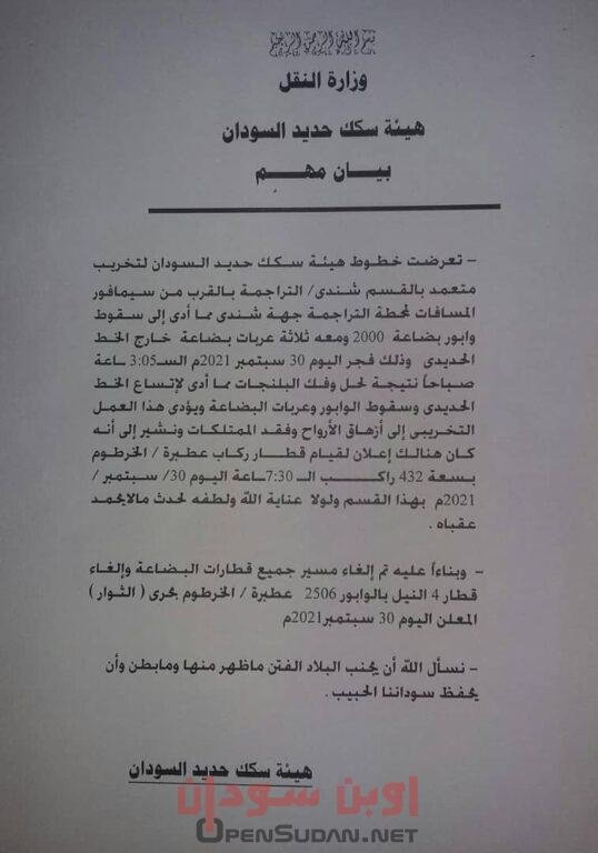 أعلنت هيئة سكك حديد السودان عن إلغاء قطار “الثوار” الذي كان مقررا وصوله من مدينة عطبرة إلى مدينة الخرطوم بسبب تخريب خط السكك الحديدية قرب مدينة شندي. وبحسب بيان صادر من هيئة سكك حديد السودان صباح يوم الخميس فإن التخريب الذي وصفته “بالمتعمد” حدث في الثالثة من فجر يوم الخميس بالقسم شندي التراجمة من خط السكة حديد. وقال البيان أنه تم فك “البلنجات” مما أدى لاتساع الخط الحديدي وسقوط وابور البضاعة 2000 ومعه 3 عربات بضاعة خارج الخط الحديدي.