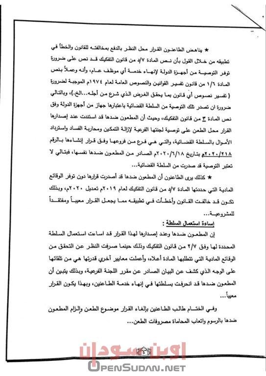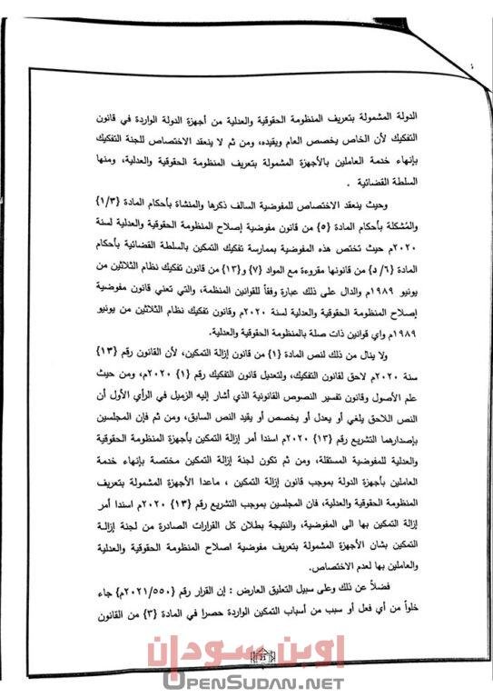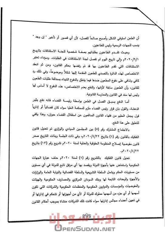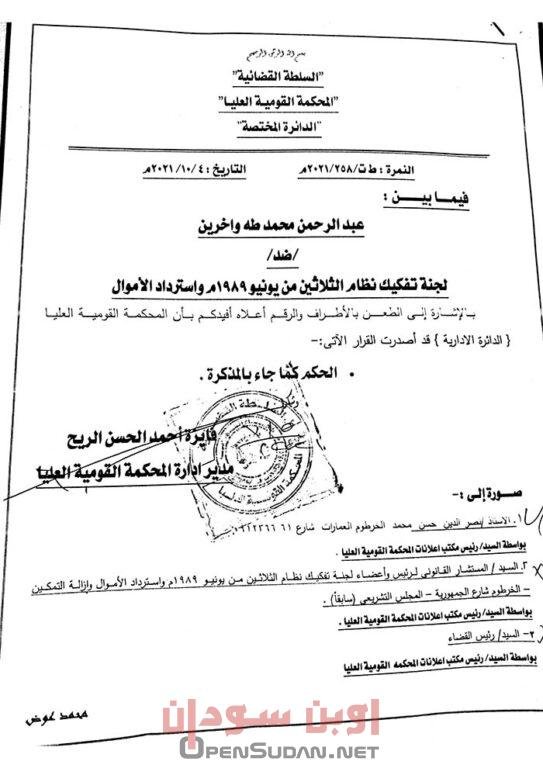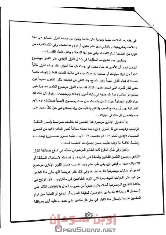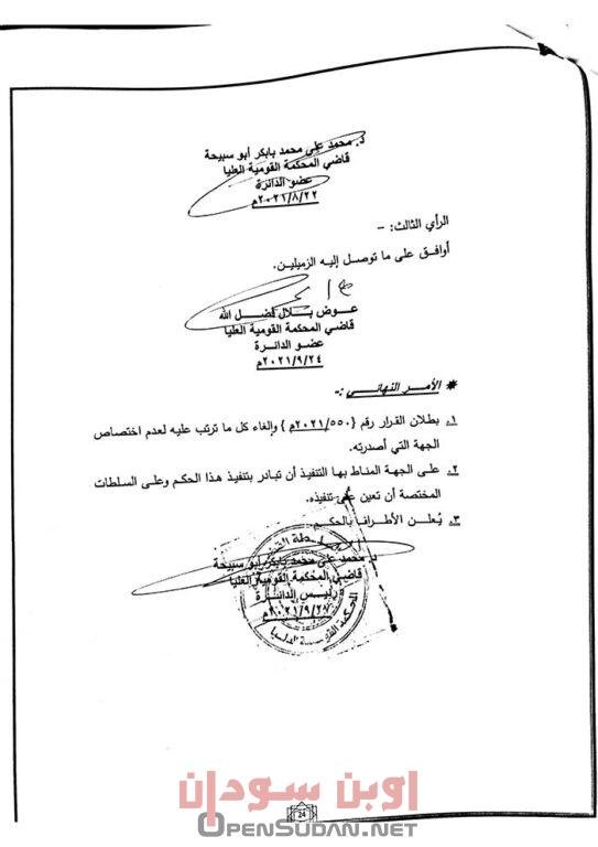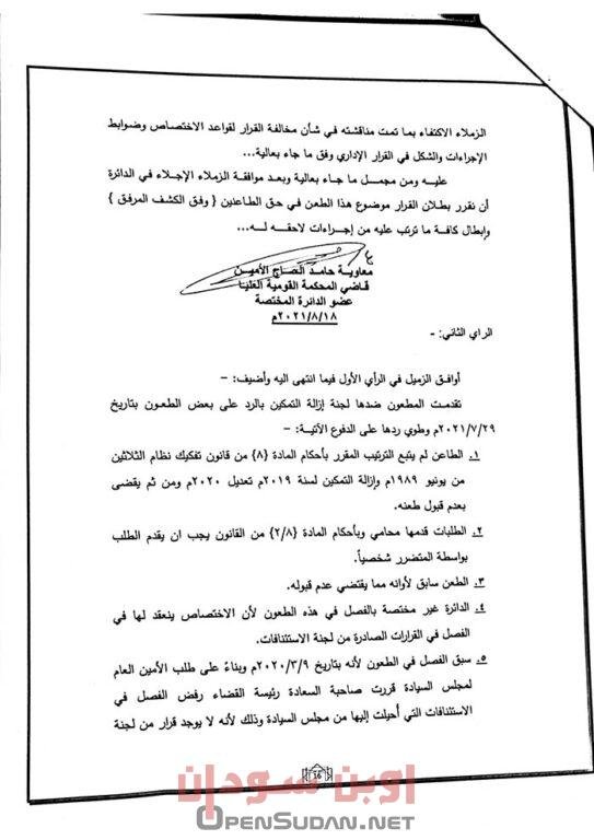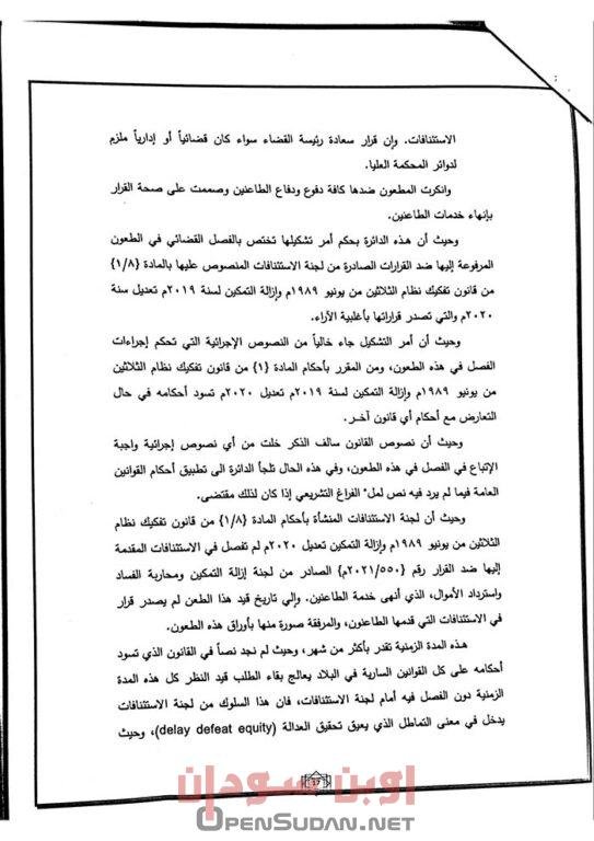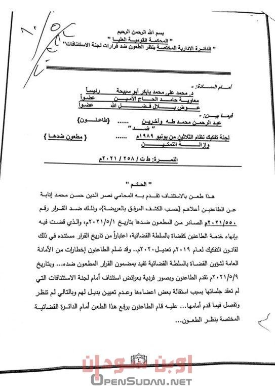 يورد موقع “اوبن سودان” أدناه ملف PDF للحكم الذي أصدرته المحكمة القومية العليا بإبطال قرار لجنة إزالة التمكين رقم 550 بفصل مجموعة من القضاة. وفي الحكم قالت المحكمة العليا أن لجنة إزالة التمكين غير مختصة بإصدار مثل هذا القرار.