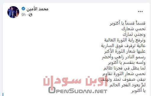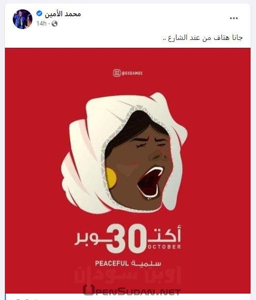 انضم الفنان محمد الأمين للداعمين لمسيرات 30 أكتوبر. ونشر الفنان الكبير على صفحته الرسمية بفيسبوك ملصقا ترويجيا لمسيرات 30 أكتوبر، وأعقبه بمقطع شعري حماسي، عن أكتوبر.
