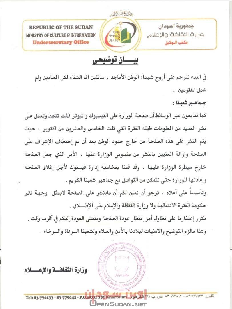 أصدرت وزارة الثقافة والإعلام السودانية عبر مكتب وكيل الوزارة بيانا قالت فيه أن صفحتها الرسمية في فيسبوك قد تم ” اختطافها” بواسطة مجهولين خارج السودان. و تبرأت الوزارة من كل ما تم نشره في الصفحة منذ الخامس والعشرين من أكتوبر الماضي.
