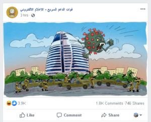 اثارت صورة نشرتها صفحة الاعلام الالكتروني لقوات الدعم السريع جدلا واسعا بين متصفحي الانترنت السودانيين . ويبدو في الصورة التي اطلع عليها موقع (اوبن سودان) رسما عملاقا لما يبدو انه فايروس كورونا يحلق في سماء الخرطوم بينما يقوم عشرات الجنود (يبدون كقوات الدعم السريع) باطلاق النار عليه.