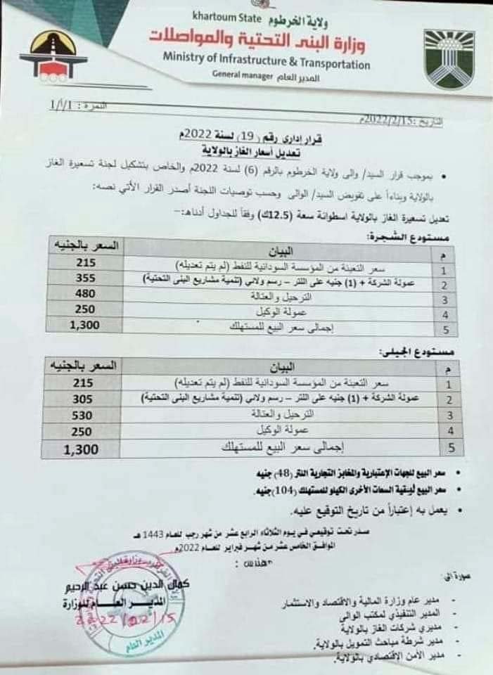 أعلنت وزارة البنى التحتية والمواصلات بولاية الخرطوم عن تعديل جديد في أسعار غاز الطبخ بالولاية. وبموجب منشور صادر عن الوزارة، قالت إن اللجنة التي شكلها والي الخرطوم لتعديل تسعيرة غاز الطبخ أوصت بتسعيرة جديدة لأسطوانات الغاز سعة 12.5 كيلوجرام أصبح سعر بيها للمستهلك 1300 جنيه. وينشر الموقع تفاصيل القرار أدناه: