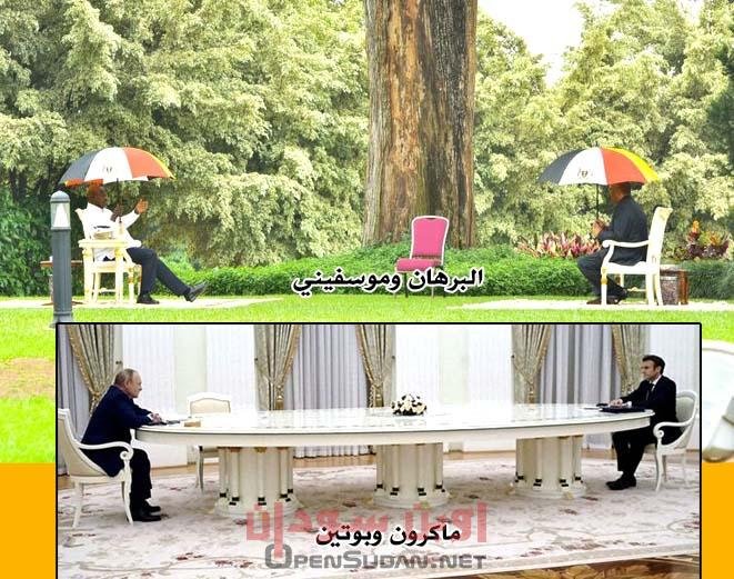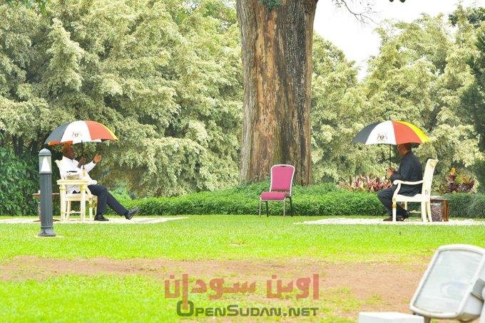 نشرت وسائل إعلام أوغندية صورة جمعت رئيس مجلس السيادة الانتقالي السوداني عبد الفتاح البرهان مع الرئيس الأوغندي يوري موسفيني. والتقطت الصورة في القصر الرئاسي (ستيت هواس) في مدينة عنتيبي الأوغندية، التي وصلها البرهان اليوم الخميس للقاء الرئيس موسفيني. وجلس الزعيمان على مقعدين متباعدين للغاية في حديقة القصر، وقد أمسك كل منها بمظلة. ولفتت المسافة بين المقعدين الأنظار، حيث أنهما بالكاد يستطيعان سماع بعضهما من هذه المسافة البعيدة. وأعادت الصورة للأذهان اللقطة الشهيرة للرئيس الروسي بوتين مع ضيفه الرئيس الفرنسي ماكرون، حيث جلسا على طرفي طاولة كبيرة للغاية، أثارت التعليقات الطريفة في وسائل الإعلام ومواقع التواصل الاجتماعي.