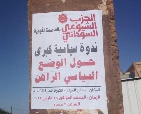 أطلق مجهولون الغاز المسيل للدموع والحجارة على ندوة للحزب الشيوعي السوداني بميدان المولد في الثورة الحارة الثامنة بمدينة أمدرمان. وتسببت الأحداث في فض الندوة وإصابة بعض الحضور بالاختناق. وكان الحزب الشيوعي بالعاصمة القومية يقيم الندوة بعنوان “الوضع السياسي الراهن”.