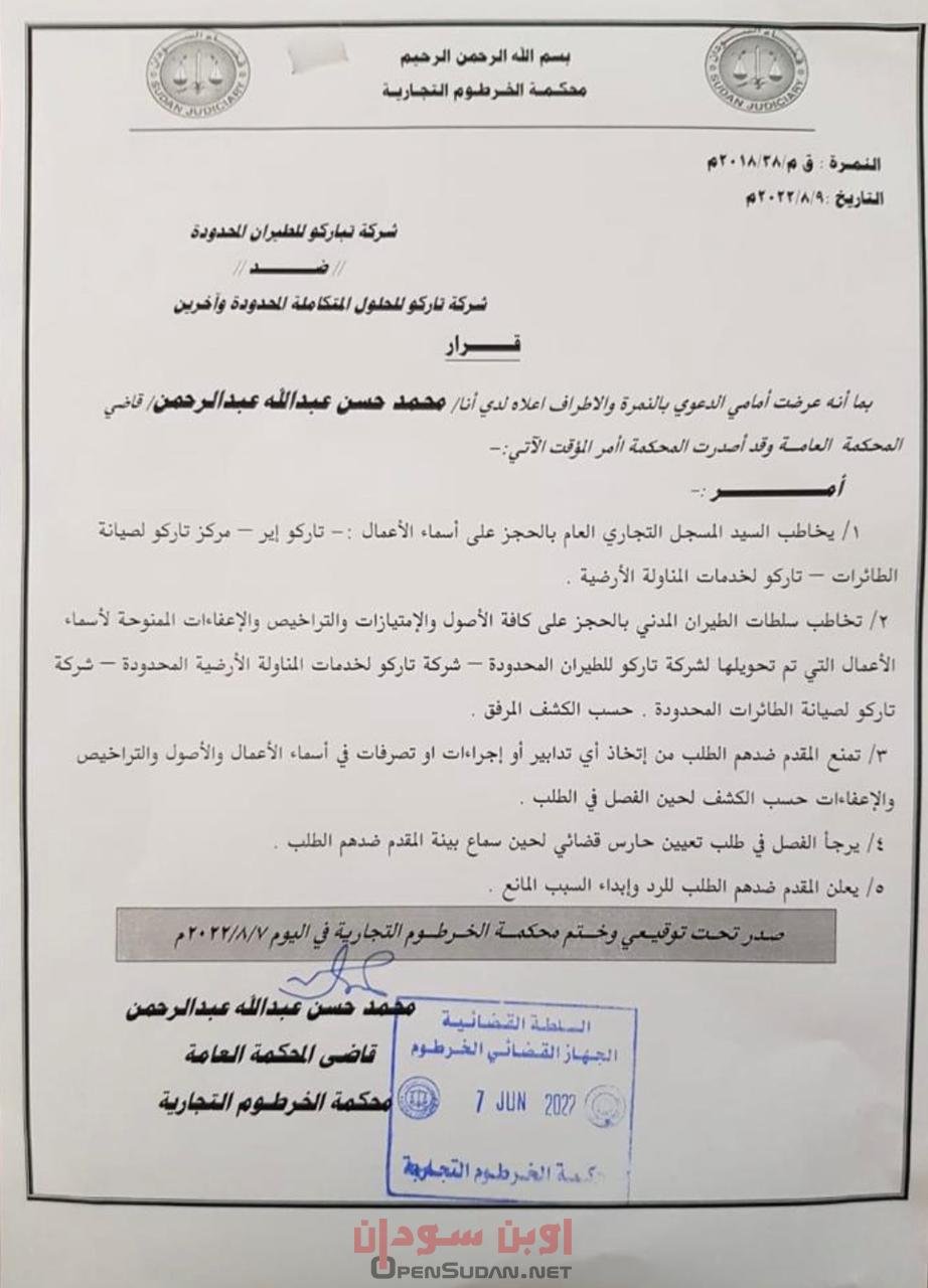 أصدر قاضي محكمة الخرطوم التجارية محمد حسن عبد الله قرار يوم الثلاثاء يالحجز على اسم العمل ” تاركو اير” ومجموعة من الشركات المرتبطة بها.