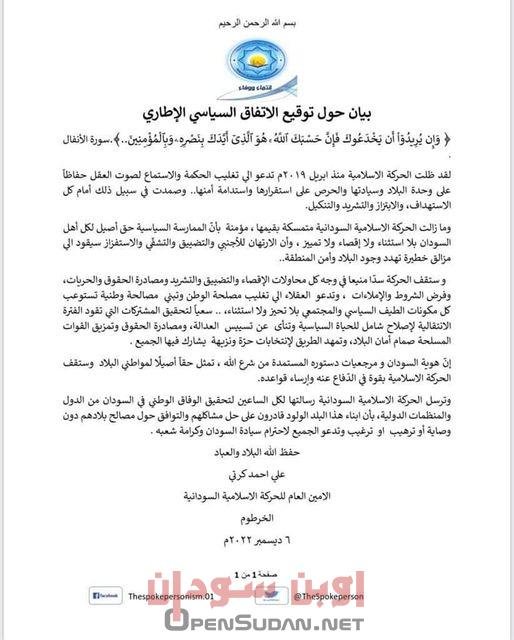 وترسل الحركة الاسلامية السودانية رسالتها لكل الساعين لتحقيق الوفاق الوطني في السودان من الدول والمنظمات الدولية، بأن ابناء هذا البلد الولود قادرون على حل مشاكلهم والتوافق حول مصالح بلادهم دون وصاية أو ترهيب او ترغيب وتدعو الجميع لاحترام سيادة السودان وكرامة شعبه .