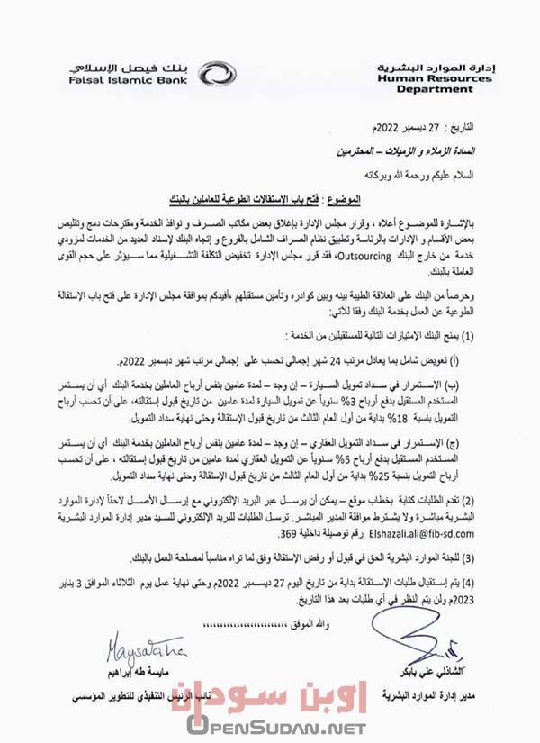 قدّم بنك فيصل الإسلامي السوداني حوافز وإغراءات كبيرة لموظفيه ليقدموا استقالاتهم، في سابقة بالجهاز المصرفي في السودان.