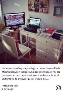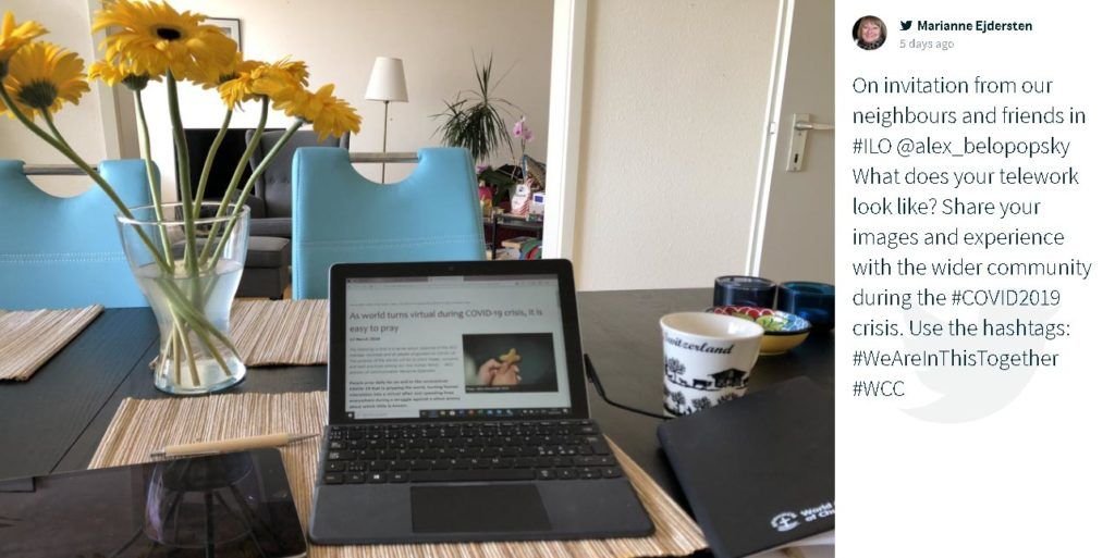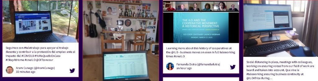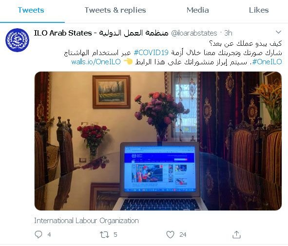 دعت منظمة العمل الدولية الناس من جميع انحاء العالم الى مشاركة صور توضح اجواء عملهم عن بعد ، ضمن الموجة العالمية من الحجر الصحي الذاتي واتجاه الناس للعمل من منازلهم بسبب انتشار فايروس كورونا.