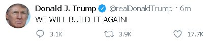 واستخدم الرئيس ترامب منصته المفضلة “تويتر” ليكتب تغريدته التي جاء فيها ( WE WILL BUILD IT AGAIN!) (سنبنيه مجدداً) وتبعت تغريدته آلاف التغريدات الساخرة والغاضبة والمؤيدة أيضاً.
