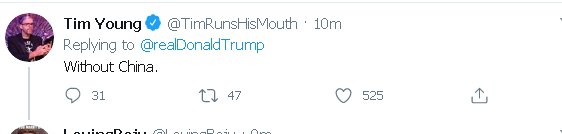 احدى المتابعات لحساب الرئيس الأمريكي ردت على تغريدة ترامب بقولها ( .. بدون الصين)، ومتابع آخر رد عليه ساخراً (لكنك لم تقم ببنائه في المرة الأولى يا سيادة الرئيس) .