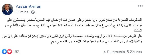 و قال عرمان في منشور في وقت متأخر من مساء الخميس : (المعلومات المسربة من سجن كوبر ،ان البشير وعلي عثمان بعد ان ضاق بهم السجن،أصبحوا يضغطون على قيادة الانقاذيين بالخارج للاسراع بتنفيذ مخطط استعادة السلطة، والانقاذيين في الخارج، صعب عليهم الفطام من السلطة ).