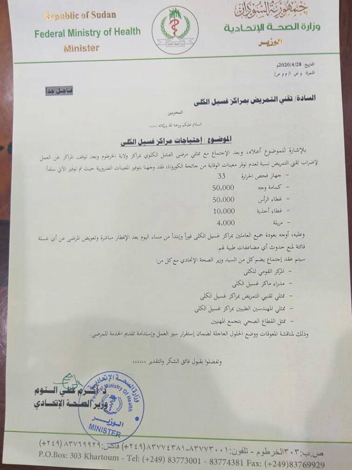 وكان مثلون لمرضى غسيل الكلى قد خاطبوا مجلس الوزراء احتجاجاً على توقف عمليات الغسيل، واجتمع بهم وزير الصحة اكرم التوم وجهات ذات صلة. وبعد الاجتماع اصدر وزير الصحة الاتحادي حطاباً لتقنيي التمريض بمراكز غسيل الكلى بالخرطوم بالعودة للعمل اعتباراً من مساء الثلاثاء، بعد ان تم توفير كمية من معدات الوقاية من فايروس كورونا.
