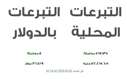 وبحسب قيمة الدولار في السوق السوداء، فإن مجمل التبرعات للحملة حتى الآن (بالعملة المحلية والدولار) بلغت حوالي 127 مليون جنيه .