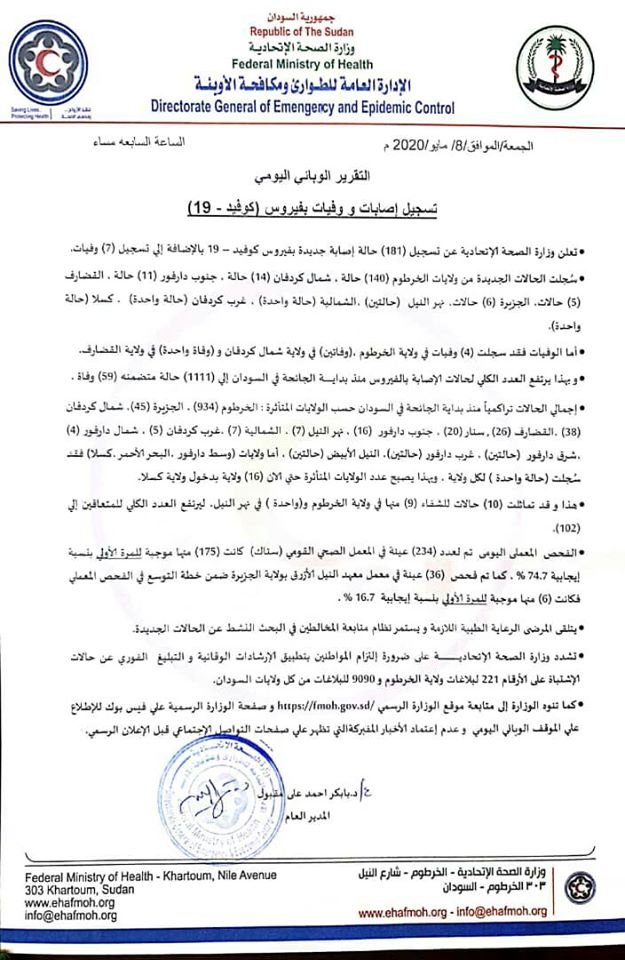 أعلنت وزارة الصحة السوداية في تقرير صدر مساء يوم الجمعة 8 مايو عن تسجيل 181 اصابة جديدة بفايروس كورونا في السودان و 7 وفيات به.