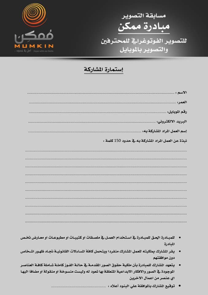 يتوجب على المشاركين في المسابقة الإطلاع على شروطها، وملء استمارة المشاركة وإرسالها الى البريد الإلكتروني المخصص للمسابقة وهو : mumkincompetition@gmail.com