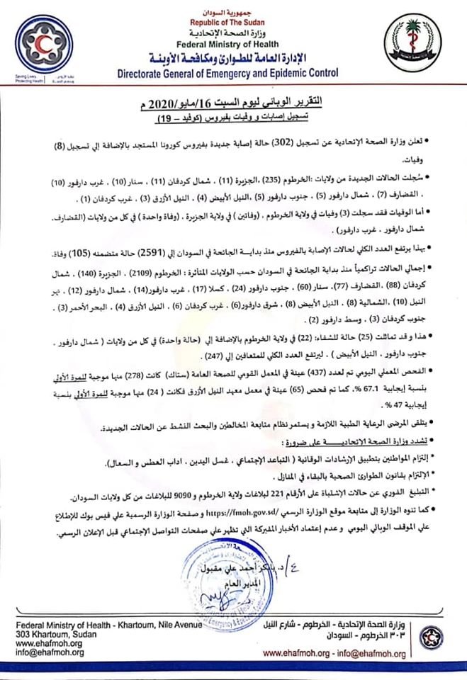 وبهذا يرتفع العدد الكلي للإصابات بفايروس كورونا منذ بدء انتشاره في السودان الى 2591 مع تسجيل 105 حالة وفاة.