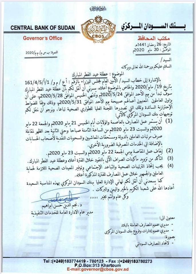 اصدر بنك السودا المركزي منشوراً يوجه فيه البنوك بالعاصمة والولايات بالعمل ايام الخميس 21 مايو والجمعة 22 مايو والسبت 23 مايو، لمقابلة متطلبات العمليات المصرفية للمواطنين من سحب نقدي ومرتبات وغيرها. وقال البنك في منشوره ان مواعيد العمل في الايم المذكورة ستكون من الثامنة صباحا حتى التانية ظهرا.