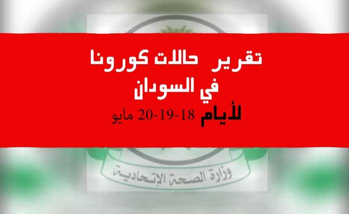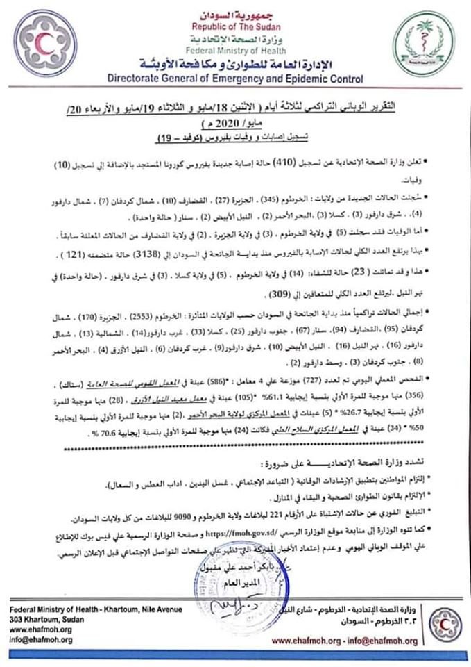أصدرت وزارة الصحة السودانية صباح الخميس تقريراً بحالات كورونا التي سجلت لثلاثة ايام ماضية هي الاثنين 18 مايو والثلاثاء 19 مايو والأربعاء 20 مايو ، واعلنت فيه تسجيل 410 اصابة جديدة بالفايروس و 10 وفيات به.