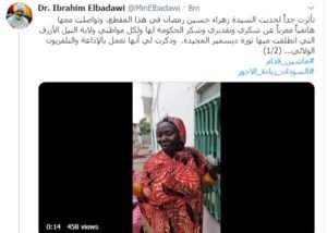 “تأثرت جداً لحديث السيدة زهراء حسين رمضان في هذا المقطع، وتواصلت معها هاتفياً معرباً عن شكري وتقديري وشكر الحكومة لها ولكل مواطني ولاية النيل الأزرق التي انطلقت منها ثورة ديسمبر المجيدة. وذكرت لي أنها تعمل بالإذاعة والتلفزيون الولائي مايقارب ال20 عاما ولم تجد إنصافاً وتقديراً مناسباً لما قدمته طوال هذه الفترة، ولقد أكدتُ لها أننا سوف نتبع الهيكل الجديد بالدعم المباشر للأسر والذى يستهدف مكافحة الفقر ودعم بناء السلام العادل والتنمية المتوازنة فى بلادنا الحبيبة بإذن الله.”