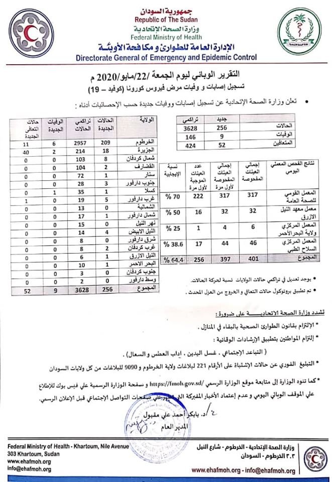 أصدرت وزارة الصحة السودانية صباح الأحد تقريرها الدوري عن حالات كورونا بالسودان ، ويغطي التقرير يوم الجمعة 22 مايو، واعلنت فيه تسجيل 256 اصابة جديدة بالفايروس و 9 حالات وفاة جديدة به.
