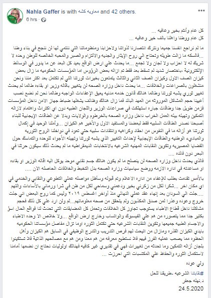 اعلنت مديرة ادارة الإعلام بوزارة الصحة الإتحادية نهلة جعفر انها تقدمت بإستقالتها من وظيفتها بالوزارة، وقالت انه تم قبولها. وقالت نهلة في منشور اعلنت فيه اسباب إستقالتها : “ما يحدث داخل وزاره الصحه لن يتغيير باقاله وزير او بقاءه طالما لم يحدث تغيير ثوري يشبه ثورتنا وطالما هنالك قانون خدمه مدنيه يعيق الإعفاءات الواجبه وطالما نحن لم نضع نصب أعيينا حجم المشاكل الموروثه من العهد البائد”.