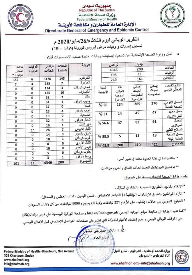 أصدرت وزارة الصحة السودانية تقريرها اليومي عن حالات كورونا بالسودان ، ويغطي التقرير يوم الثلاثاء 26 مايو، واعلنت فيه تسجيل 200اصابة جديدة بالفايروس و 11 حالات وفاة جديدة به. وسجلت 6 من حالات الوفاة بولاية الخرطوم و4 حالات بالجزيرة وحالة واحدة بالنيل الأبيض .
