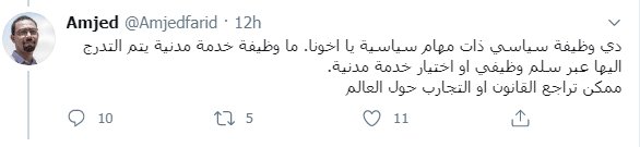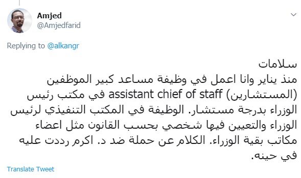 امجد فريد، الذي ينشط على تويتر، علق على المنشورات المستنكرة، واوضح انه يشغل وظيفة “مساعد كبير الموظفين “المستشارين” في مكتب رئيس الوزراء بدرجة مستشار” وقال انه تم تعيينه في الوظيفة منذ يناير الماضي.