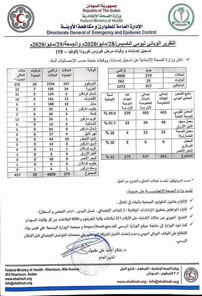 أصدرت وزارة الصحة السودانية تقريرها اليومي عن حالات كورونا بالسودان ، ويغطي التقرير يومي الخميس 28 مايو، والجمعة 29 مايو، واعلنت فيه تسجيل 279 اصابة جديدة بالفايروس و 29 حالة وفاة جديدة به.