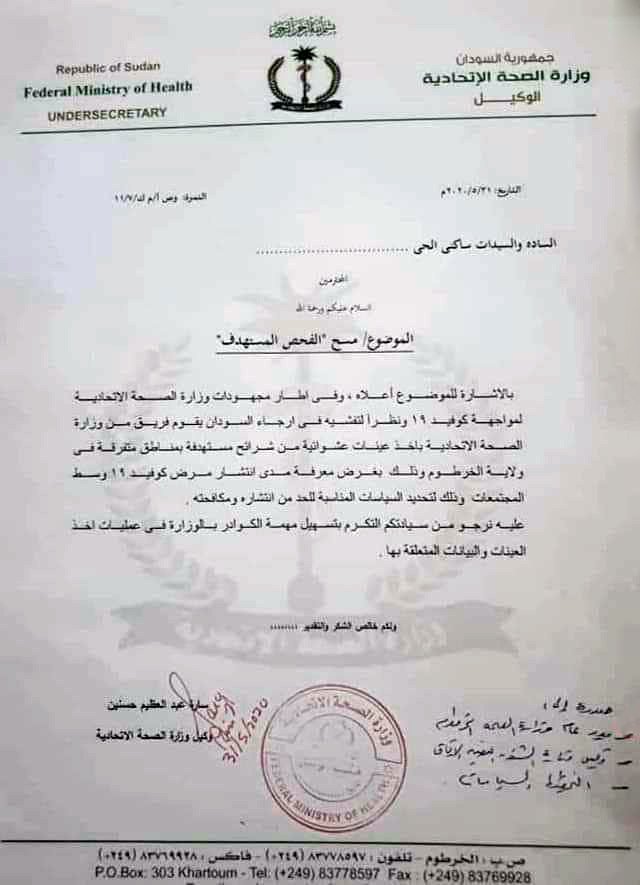 وقالت تقارير ان الفحوصات جاءت بتوصية من فريق الخبراء الطبيين الصيني الذي يزور السودان حالياً. واصدرت الوزارة استمارة موجهة للمواطنين، تحمل توقيع وكلية الوزارة الاتحادية سارة عبد العظيم، اوضحت فيها انها تسعى لمعرفة مدى انتشار الفايروس وسط المجتمعات لتحديد السياسات المناسبة للتعامل معه.