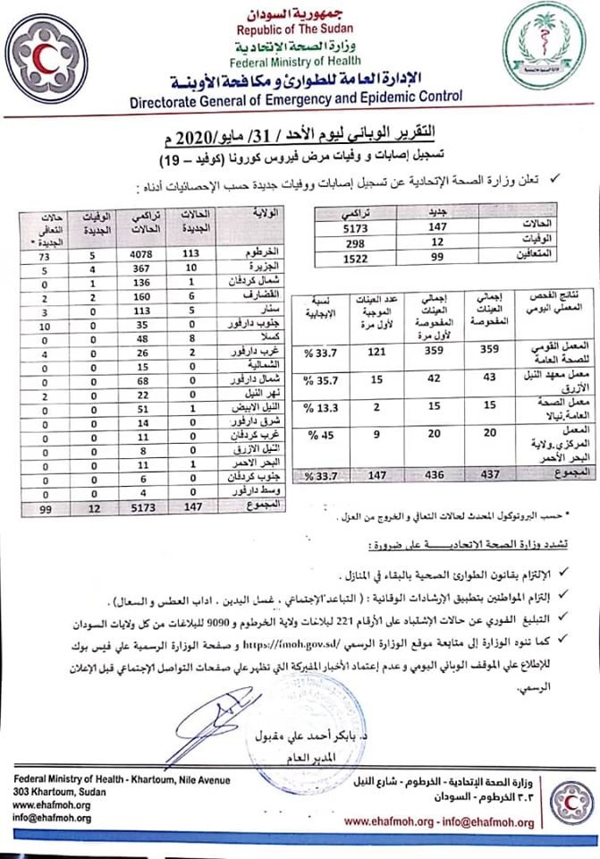 أصدرت وزارة الصحة السودانية تقريرها اليومي عن حالات كورونا بالسودان ، ويغطي التقرير يوم الأحد 31 مايو، واعلنت فيه تسجيل 147 اصابة جديدة بالفايروس و 12 حالة وفاة جديدة به.