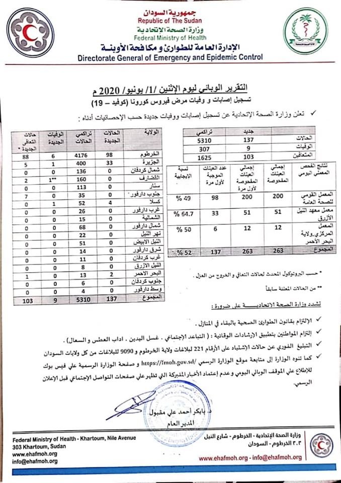 أصدرت وزارة الصحة السودانية تقريرها اليومي عن حالات كورونا بالسودان ، ويغطي التقرير يوم الأثنين الأول من يونيو ، واعلنت فيه تسجيل 137 اصابة جديدة بالفايروس و 9 حالات وفاة جديدة به.