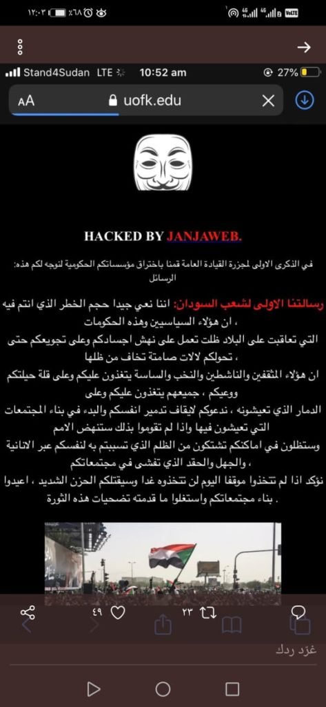 ولم تتضح على الفور الجهة المنفذة للاختراق الإلكتروني، كما لم يصدر توضيح رسمي من إدارة جامعة الخرطوم.ووجّه المخترقون أربع رسائل بمناسبة ذكرى فض اعتصام القيادة العامة الذي راح ضحيته أكثر من 150 شخصا. و دعوا الحكومة السودانية للعمل “وفق أهداف الثورة التي قدمت الشهداء” ، وتوعّدوا العسكريين “بكشف مؤامرتهم”، ووصفوا السياسيين “بالفشل في قيادة المرحلة” ، كما دعوا الشعب السوداني بضرورة التحرك العاجل للوقف ضد من “يعبث بثورته من السياسيين والعسكرين”