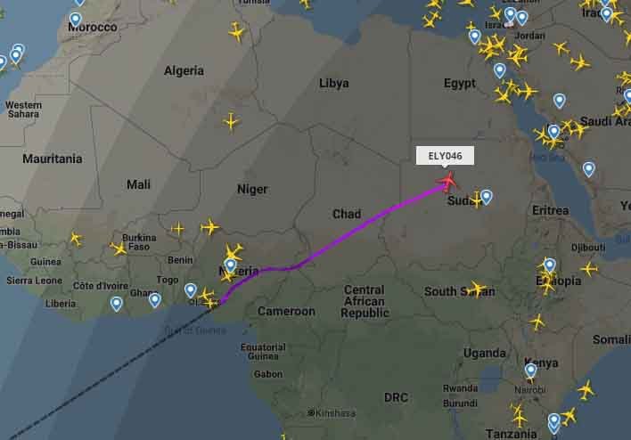تحلق في الأجواء السودانية الآن طائرة اسرائيلية من شركة الخطوط الجوية الاسرائيلية (العال) متجهة الى تل ابيب. ورصد محررو (اوبن سودان) الطائرة التي اقلعت من مدينة بيونس ايرس ومرت فوق اجواء نيجريا ثم تشاد، مرورا الان بالشمال الغربي من السودان (9:25 مساء الخميس) . تحمل الطائرة رقم التتبع ELY046 (يشير حرفا EL الى طائرات شركة العال El AL)، وهي من طراز بوينغ 787 دريملاينر.